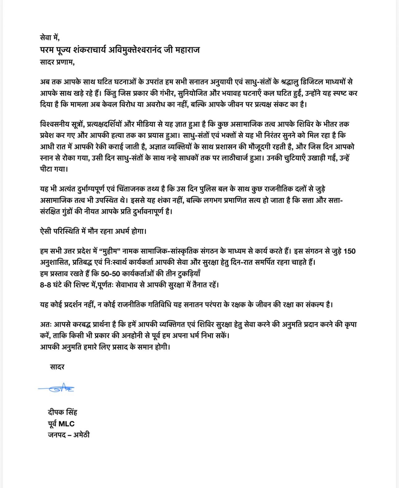 पूर्व एमएलसी दीपक सिंह (Former Congress MLC Deepak Singh) ने अपने पत्र में शंकराचार्य की सुरक्षा को लेकर गंभीर चिंता व्यक्त की है। उन्होंने लिखा है कि विश्वसनीय सूत्रों, प्रत्यक्षदर्शियों और मीडिया रिपोर्ट्स के अनुसार, कुछ असामाजिक तत्व शंकराचार्य के शिविर क्षेत्र में घुस गए थे और उनकी हत्या का प्रयास भी किया गया।