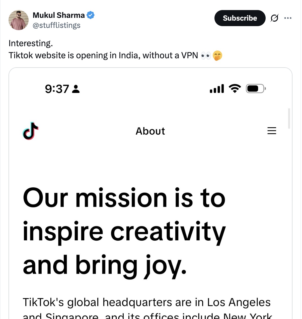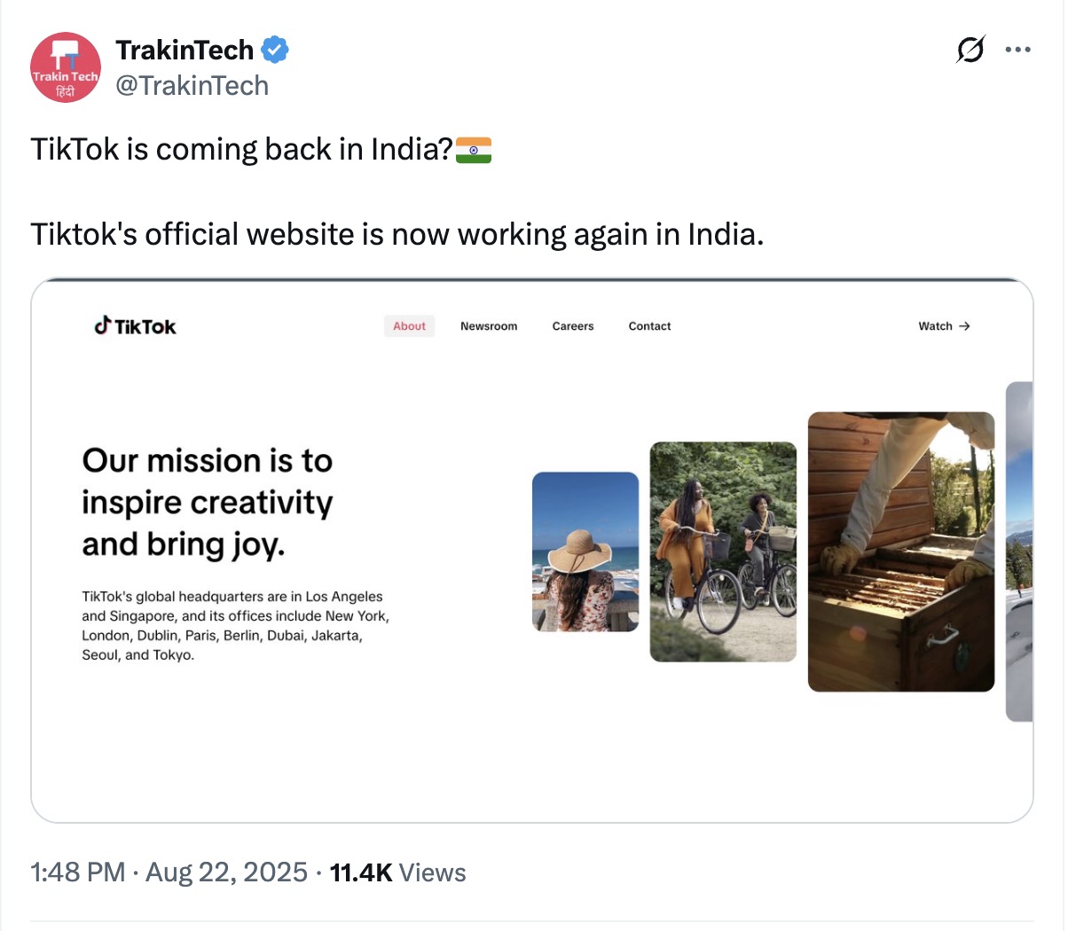 टिप्सटर मुकुल शर्मा ने भी एक ऐसा ही स्क्रीनशॉट पोस्ट किया, जिसमें लिखा था, “दिलचस्प। TikTok वेबसाइट भारत में बिना VPN के खुल रही है।” इससे अटकलों को और बल मिला। बता दें कि चीन के साथ तनाव के चलते भारत ने TikTok और कई अन्य चीनी ऐप्स को 2020 में प्रतिबंधित कर दिया था। तब से, न तो यह ऐप और न ही वेबसाइट उपलब्ध है। Trakin Tech के पोस्ट ने तुरंत ध्यान खींचा, लेकिन जब हमने खुद TikTok की वेबसाइट देखी, तो वह अभी भी बंद थी। न ही इसे लेकर भारत में Google Play Store और Apple के App Store पर कोई संकेत मिले हैं।