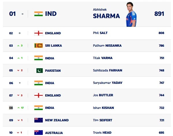 ICC की ताज़ा रैकिंग (Latest ICC rankings) में कुल मिलाकर टॉप-10 में भारत के चार बल्लेबाज शामिल हैं, जो टीम इंडिया की मजबूत टी20 बल्लेबाज़ी लाइन-अप को दिखाता है। बुधवार 18 फरवरी को ICC की ताज़ा टी20 बल्लेबाज रैंकिंग में भारतीय खिलाड़ियों का दबदबा साफ दिख रहा है। खराब फॉर्म से जूझ रहे युवा ओपनर अभिषेक शर्मा 891 रेटिंग अंकों के साथ दुनिया के नंबर-1 बल्लेबाज बने हुए हैं। इंग्लैंड के फिल सॉल्ट (Phil Salt) 808 अंकों के साथ दूसरे स्थान पर हैं, जबकि टी20 वर्ल्ड कप में पहला शतक जड़ने वाले श्रीलंका के पथम निसंका (Pathum Nissanka) तीन पायदान की छलांग लगाकर तीसरे नंबर पर पहुंच गए हैं।
