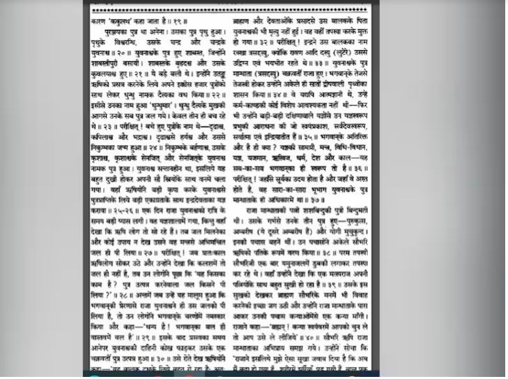 सोशल मीडिया साइट इंस्टाग्राम पर इस पोस्ट में देवव्रत राजा युवनाश्व की कहानी सुनाते हैं। वह बताते हैं, रामायण में राजा दशरथ की ही तरह, महाभारत में युवनाश्व को भी उत्तराधिकारी न होने को लेकर चिंता थी। इसी की वजह से उन्होंने भी राजा दशरथ की तरह पुत्र के लिए यज्ञ करवाया। यज्ञ के बाद उन्हें भी एक पवित्र द्रव्य चरु दिया गया, जिसे उन्हें अपनी पत्नी को पिलाना था, लेकिन समय का खेल ऐसा हुआ की वह जंगल में भटक गए और प्यास की वजह से उन्होंने वही पानी पी लिया। इसके बाद जो हुआ वह आधुनिक दृष्टि से कल्पना जैसा लगता है, लेकिन युवनाश्व को गर्भ ठहर गया। पटनायक के मुताबिक, गर्भ राजा के अंदर भी सामान्य स्थिति में रहा। प्रसव का समय निकट आने लगा तो राजा कि चिंता हुई की आखिर यह कैसे होगा? इसके बाद उन्होंने देवताओं का आह्वान किया। महाराभारत कथा के मुताबिक या तो देवराज इंद्र ने या फिर अश्वनीकुमार ने राजा की जांघ से उस बच्चे का जन्म करवाया। कथा के अनुसार उस बालक का नाम मंधाता रखा गया।