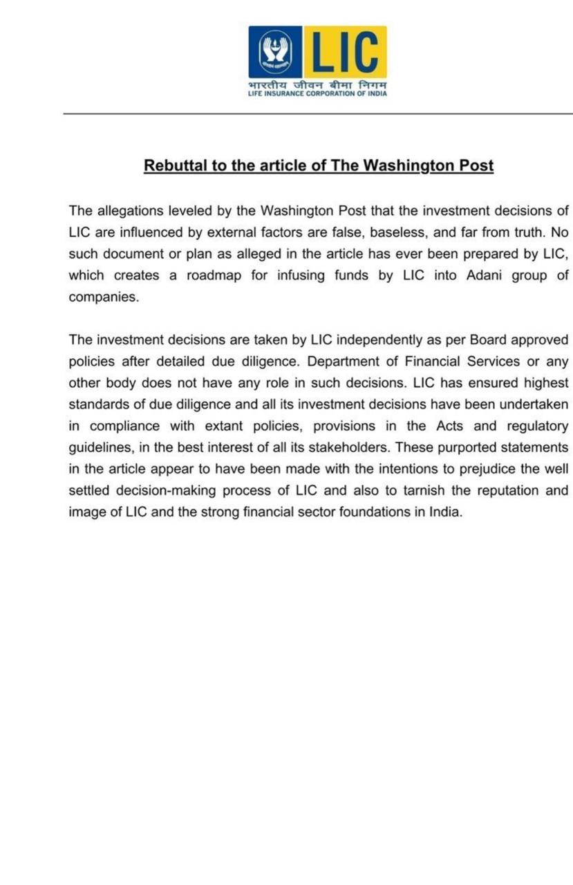 वाशिंगटन पोस्ट के तरफ से लगाए गए आरोप कि एलआईसी के निवेश निर्णय बाहरी कारकों से प्रभावित होते हैं, झूठे, निराधार और सत्य से कोसों दूर हैं। लेख में उल्लिखित ऐसा कोई दस्तावेज़ या योजना एलआईसी के तरफ से कभी तैयार नहीं की गई है, जो अदानी समूह की कंपनियों में एलआईसी के तरफ से धन निवेश करने का रोडमैप तैयार करे।