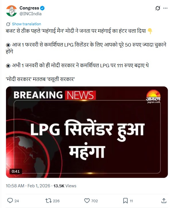 19 किलो वाले कमर्शियल LPG सिलेंडर की कीमत बढ़ने पर कांग्रेस ने एक्स पोस्ट में लिखा, ” बजट से ठीक पहले ‘महंगाई मैन’ मोदी ने जनता पर महंगाई का हंटर चला दिया… आज 1 फरवरी से कमर्शियल LPG सिलेंडर के लिए आपको पूरे 50 रुपए ज्यादा चुकाने होंगे… अभी 1 जनवरी को ही मोदी सरकार ने कमर्शियल LPG पर 111 रुपए बढ़ाए थे… ‘मोदी सरकार’ मतलब ‘वसूली सरकार’…”