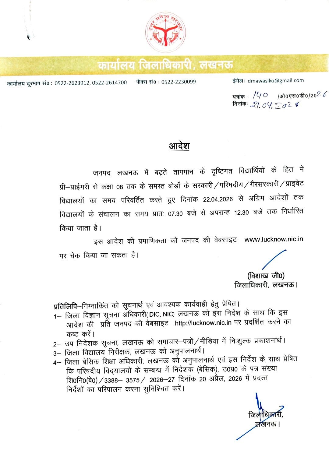 जिलाधिकारी ने अपने जारी आदेश में कहा कि, लखनऊ में बढ़ते तापमान के दृष्टिगत विद्यार्थियों के हित में प्री-प्राईमरी से कक्षा 8 तक के समस्त बोडी के सरकारी/ परिषदीय / गैरसरकारी/प्राश्वेट विद्यालयों का समय परिवर्तित करते हुए दिनांक 22.04.2028 से अग्रिम आदेशों तक विद्यालयों के संचालन का समय प्रातः 07.30 बजे से अपरान्ह 12.30 बजे तक निधर्धारित किया जाता है।