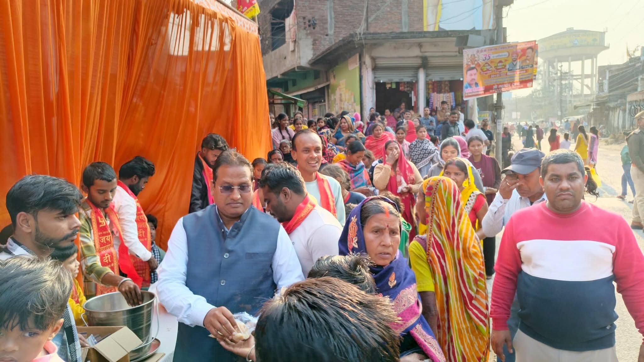 पुरानी नौतनवा चौराहे पर राजीव गांधी कॉलेज ऑफ फार्मेसी के निदेशक डॉ. शोभाराम साहू द्वारा प्रसाद वितरण किया गया।