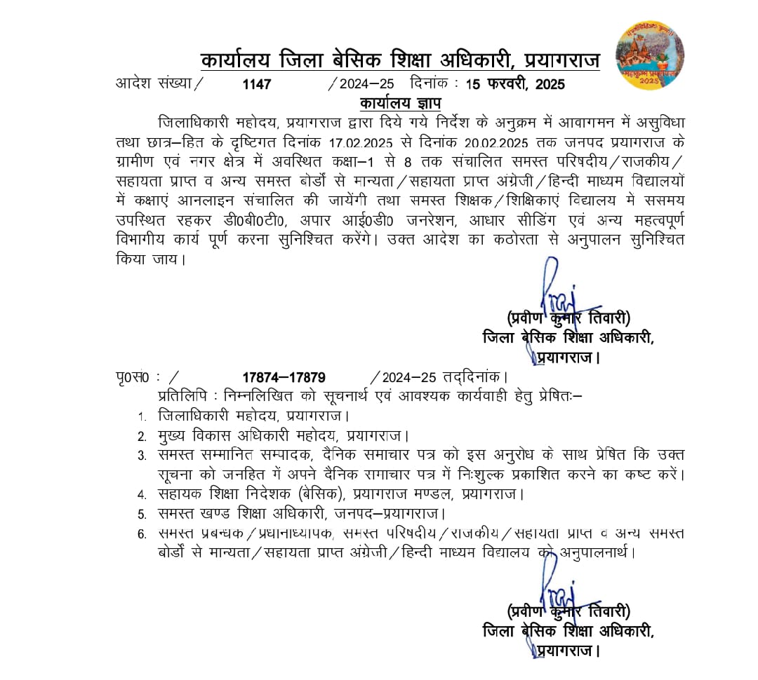 प्रयागराज। प्रयागराज महाकुंभ (Prayagraj Maha Kumbh) में डुबकी लगाने के लिए श्रद्धालुओं लगातार आना जारी है। इस भीड़ और जाम की समस्या को देखते हुए प्रयागराज के जिलाधिकारी के 8वीं तक के स्कूलों में छुट्टी बढ़ा दी है। आज तक स्कूल बंद थे। अब इसे बढ़ा 20 फरवरी तक कर दिया गया है। BSA प्रवीण कुमार तिवारी (BSA Praveen Kumar Tiwari) ने बताया कि इस दौरान ऑनलाइन कक्षाएं (Online Classes) चलेंगी।