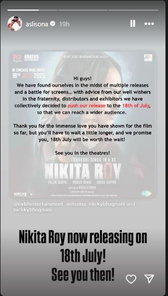 मेकर्स ने मूवी को 27 जून बजाय 18 जून को रिलीज करने की घोषणा किया। वहीं अगर बात करें की फिल्म रिलीज डेट टालने की तो उसका कारण भी सामने आ गया है। बता दें की 27 जून यानी आज के दिन ही 2 और फिल्म रिलीज हो रही है। आज ही सिनेमाघरों में काजोल की फिल्म ‘ माँ ‘ और अक्षय कुमार की फिल्म ‘ कन्नपा’ रिलीज हुई है। फिल्म पोस्टपोन होने की जानकारी सोनाक्षी सोशल मीडिया के जरिये खुद दी। सोनाक्षी और फिल्म मेकर्स ने पोस्ट शेयर करते हुए लिखा ‘दोस्तों! हम खुद को कई रिलीज और स्क्रीन के लिए लड़ाई के बीच में पाते हैं। मेकर्स ने 18 जुलाई को रिलीज करने की बात कही है। अब तक आपलोग लोग के इस इतंज़ार और प्यार देने लिए मैं ध्यानवाद करता हूं। हम सब सिनेमाघरों में मिलेंगे तब तक उम्मीद करता हूं कि आप प्यार और इंतज़ार वैसा करेंगे । इसके बाद मूवी न रिलीज को लेकर फैंस के लिए बड़ा शॉकिंग न्यूज़ है।