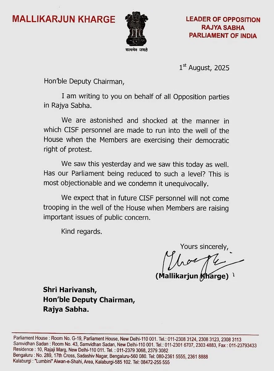 कांग्रेस अध्यक्ष और राज्यसभा में विपक्ष के नेता मल्लिकार्जुन खरगे (Leader of Opposition in Rajya Sabha Mallikarjun Kharge) ने उपसभापति डॉ. हरिवंश (Deputy Chairman Dr. Harivansh) को लिखे पत्र में कहा, कि हम इस बात से हैरान और स्तब्ध हैं कि सीआईएसएफ कर्मियों (CISF Jawans) को सदन के वेल में प्रवेश की अनुमति दी जा रही है। उन्होंने कहा कि जिस समय राज्यसभा सदस्य जब अपने लोकतांत्रिक अधिकार का प्रयोग कर रहे हैं। उस समय सुरक्षाकर्मियों का सदन के वेल में आना बेहद आपत्तिजनक है और वे इसकी कड़ी निंदा करते हैं। खरगे ने लिखा,कि हम उम्मीद करते हैं कि भविष्य में, जब सदस्य जनहित के महत्वपूर्ण मुद्दे उठा रहे होंगे, तो सीआईएसएफ कर्मी (CISF Jawans) सदन के वेल में नहीं आएंगे।