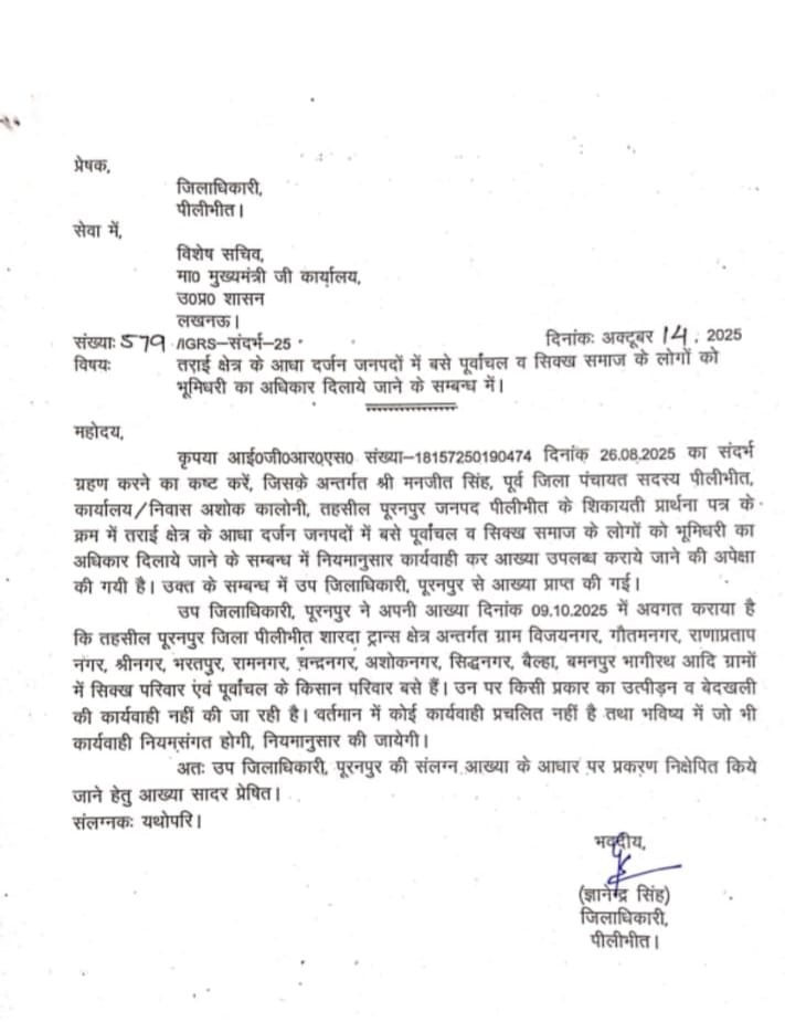 आए दिन तहसील के कर्मचारी भूमिधरी का अधिकार न मिलने के कारण किसानों को परेशान करते रहते हैं। यही नहीं, कई किसानों की गन्ने के सट्टे भी बंद कर दिए गए हैं। इस संबंध में उत्तर प्रदेश के मुख्यमंत्री ने जांच के आदेश दिए थे। साथ ही, जिलाधिकारी पीलीभीत ने 14 अक्टूबर 2025 को अपनी जांच कराकर मुख्यमंत्री के विशेष सचिव को अपनी रिपोर्ट भेजी है, जिसमें बताया गया है कि पूरनपुर तहसील के विजयनगर गौतम नगर राणाप्रताप नगर श्रीनगर भरतपुर रामनगर चंदनगर अयोध्यानगर सिद्धनगर बैलहा बमनपुर भागीरथ टाटरगंज चंदिया हजारा शास्त्रीनगर कबीरगंज नरोसा शांतिनगर अशोक नगर आदि ग्रामों में सिख व पूर्वांचल के किसान परिवार बसे हैं। उन पर किसी भी प्रकार का उत्पीडन व बेदखली की कार्यवाही नहीं की जा रही है वर्तमान में कोई भी कार्रवाई प्रचलित नहीं है।