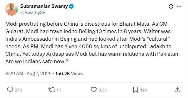 PM Modi’s possible visit to China: अमेरिका के राष्ट्रपति डोनाल्ड ट्रंप की ओर से भारत पर कुल 50 प्रतिशत लगाए जाने की घोषणा के बाद देश में सियासी घमासान छिड़ा हुआ है। ट्रंप के इस फैसले से भारत का उद्योग क्षेत्र बड़े स्तर पर प्रभावित हो सकता है। इस मुश्किल घड़ी के बीच पीएम नरेंद्र मोदी के चीन यात्रा की संभावना जताई जा रही है। जिसको लेकर पूर्व केंद्रीय मंत्री सुब्रमण्यम स्वामी ने पीएम मोदी पर निशाना साधा है।
