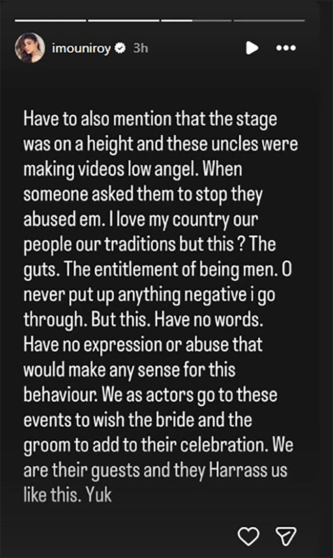 मौनी ने आगे कहा कि वो उनके साथ हुए इस इंसीडेंट के बाद से ट्रॉमा में हैं। एक्ट्रेस बोलीं कि वो इसके बाद भी नहीं रुके और न ही किसी परिवार के सदस्य या ऑर्गेनाइजर ने उन्हें वहां से हटाया। अगर मेरे जैसे इंसान को इन सब चीजों को सामना करना पड़ रहा है, तो मैं सोच भी नहीं सकती कि उन नई लड़कियों का क्या हाल होता होगा, जो अभी काम करना और शो करना शुरू कर रही हैं। मौनी बोलीं कि मैं बहुत अपमानित और डरा हुआ महसूस कर रही हूं। मैं चाहती हूं कि अधिकारी इस दुर्व्यवहार के खिलाफ कार्रवाई करें। हम कलाकार हैं, जो अपनी कला के जरिए ईमानदारी से रोजी-रोटी कमाने की कोशिश कर रहे हैं। ये आदमी तब क्या करेंगे अगर इनके दोस्त इनकी खुद की बेटियों, बहनों या परिवार के सदस्यों के साथ ऐसा ही व्यवहार करें। शर्म आनी चाहिए।