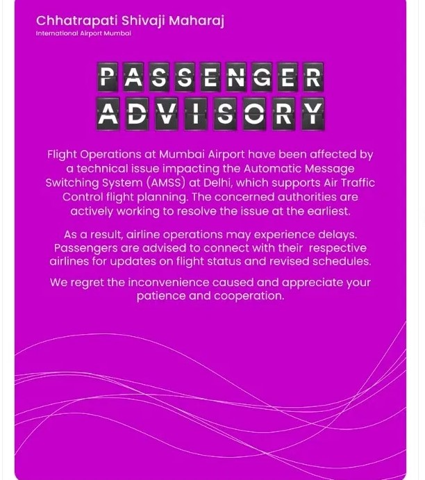 मुंबई एयरपोर्ट (Mumbai Airport) की तरफ से जारी एडवाइजरी में कहा गया, दिल्ली स्थित स्वचालित संदेश स्विचिंग सिस्टम (AMSS) में आई एक तकनीकी समस्या के कारण मुंबई हवाई अड्डे (Mumbai Airport) पर भी उड़ान संचालन प्रभावित हुआ है। एयर ट्रैफ़िक कंट्रोल (ATC) में इस प्रणाली से मदद मिलती है। संबंधित अधिकारी इस समस्या का जल्द से जल्द समाधान करने के लिए सक्रिय रूप से काम कर रहे हैं। एयरलाइन संचालन में देरी की आशंका के बीच यात्रियों को सलाह दी जाती है कि यात्रा से पहले उड़ान की स्थिति और संशोधित शेड्यूल अपडेट के बाद ही यात्रा करें। अद्यतन सूचना के लिए यात्रियों को अपनी संबंधित एयरलाइनों से संपर्क करने की सलाह दी गई है। असुविधा के लिए खेद जताते हुए एयरपोर्ट प्रबंधन ने धैर्य और सहयोग के लिए आभार भी प्रकट किया है।