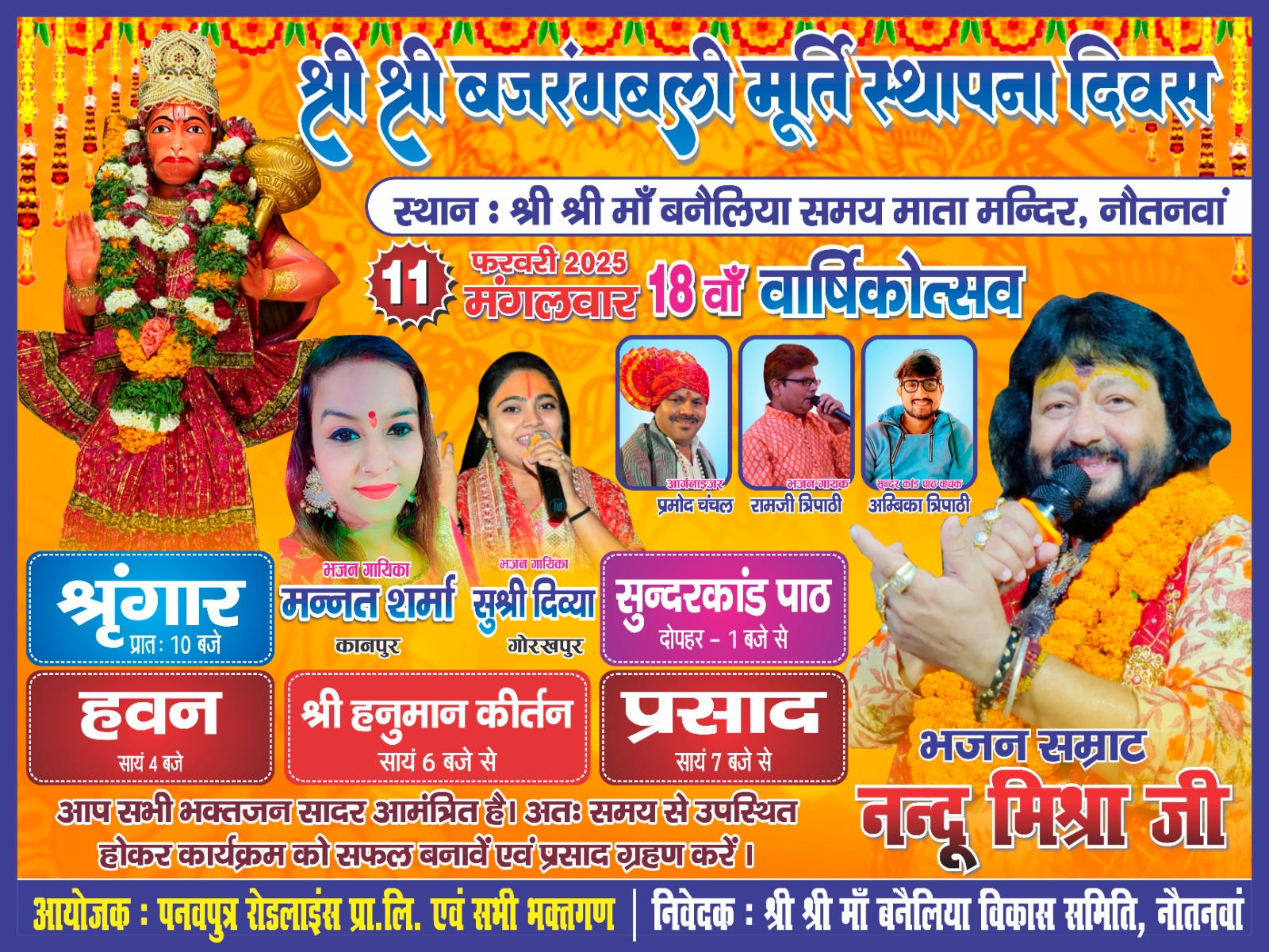 पर्दाफाश न्यूज़ ब्यूरो महराजगंज :: भारतीय सीमा ही नहीं बल्कि पड़ोसी राष्ट्र नेपाल में विख्यात नौतनवा में स्थित माता बनैलिया मंदिर में स्थापित श्री श्री बजरंगबली की 18वां प्राण प्रतिष्ठा मूर्ति स्थापना दिवस बड़े ही धूमधाम से मनाया जाने की तैयारी जोर-शोर पर चल रही है।