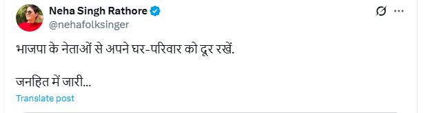 नेहा सिंह ने इस खबर को एक्स पर शेयर कर जनता को चेतावनी दी है कि बीजेपी (BJP) नेताओं को अपने परिवार से दूर रखें। उन्होंने लिखा है, कि भाजपा के नेताओं से अपने घर-परिवार को दूर रखें। जनहित में जारी…”