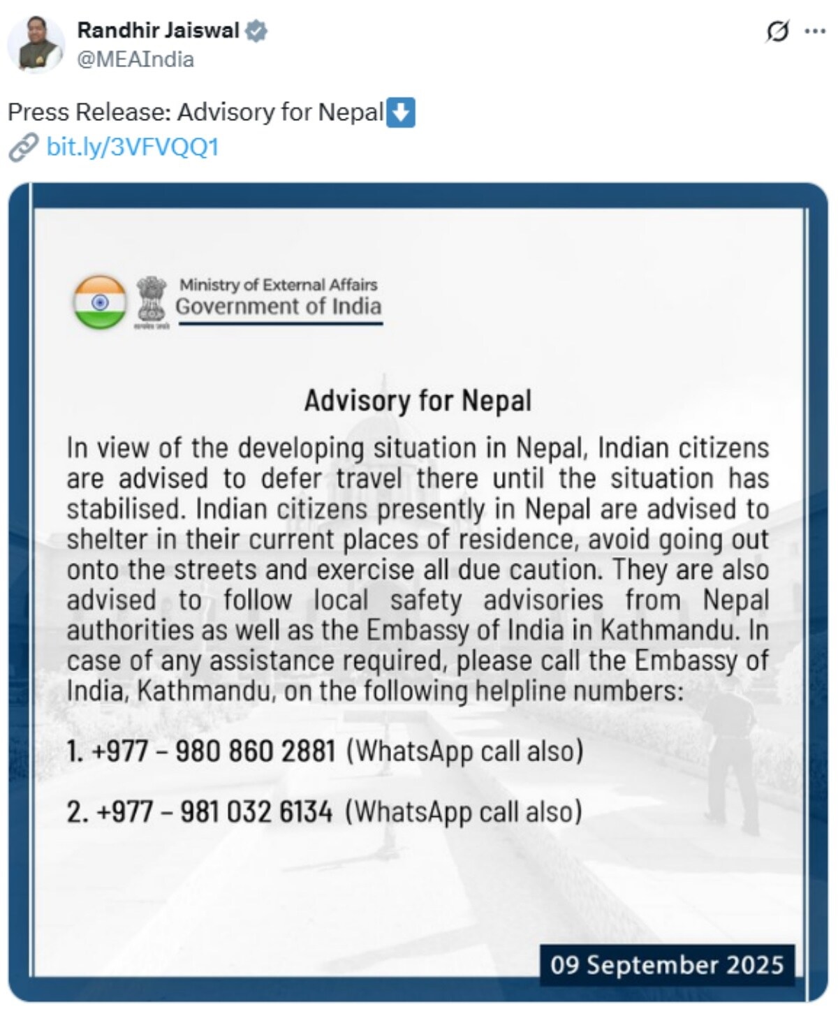 नेपाल में जारी हिंसक प्रदर्शनों और राजनीतिक अस्थिरता को देखते हुए भारत सरकार ने वहां यात्रा करने की योजना बना रहे भारतीय नागरिकों के लिए एडवाइजरी जारी की है। विदेश मंत्रालय ने कहा कि मौजूदा हालात बेहद संवेदनशील हैं। ऐसे में भारतीय नागरिक फिलहाल नेपाल की यात्रा स्थगित करें, जो भारतीय पहले से नेपाल में मौजूद हैं। उन्हें अपने निवास स्थान पर ही रहने, सड़कों पर निकलने से बचने और पूरी सतर्कता बरतने की सलाह दी गई है। साथ ही उनसे अपील की गई है कि नेपाल सरकार और भारतीय दूतावास, काठमांडू द्वारा जारी सुरक्षा सलाहों का पालन करें। किसी भी आपात स्थिति या सहायता के लिए भारतीय दूतावास, काठमांडू के हेल्पलाइन नंबर पर संपर्क किया जा सकता है। सरकार ने कहा कि भारतीयों की सुरक्षा सर्वोच्च प्राथमिकता है। नेपाल के हालात पर लगातार नजर रखी जा रही है।