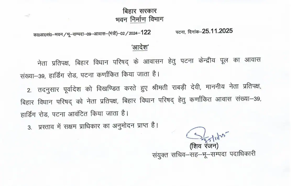 भवन निर्माण विभाग के संयुक्त सचिव-सह-भू-सम्पदा पदाधिकारी शिव रंजन ने यह लेटर निकाला है। राबड़ी आवास 2006 से लालू परिवार का ठिकाना हुआ करता था। जो अब बदल जाएगा। भवन निर्माण विभाग में यह आदेश जारी किया है और राबड़ी देवी और तेजश्वी यादव का आवास बदल दिया है।