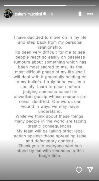 पलाश ने आगे लिखा, जब हम इन बातों के बारे में सोचते हैं, तो दुनिया में कई लोग गंभीर परिणामों का सामना कर रहे होते हैं। मेरी टीम झूठी और अपमानजनक स्टोरी फैलाने वालों के खिलाफ सख्त कानूनी कार्रवाई करेगी। इस कठिन समय में मेरे साथ खड़े रहने वाले सभी लोगों का धन्यवाद।