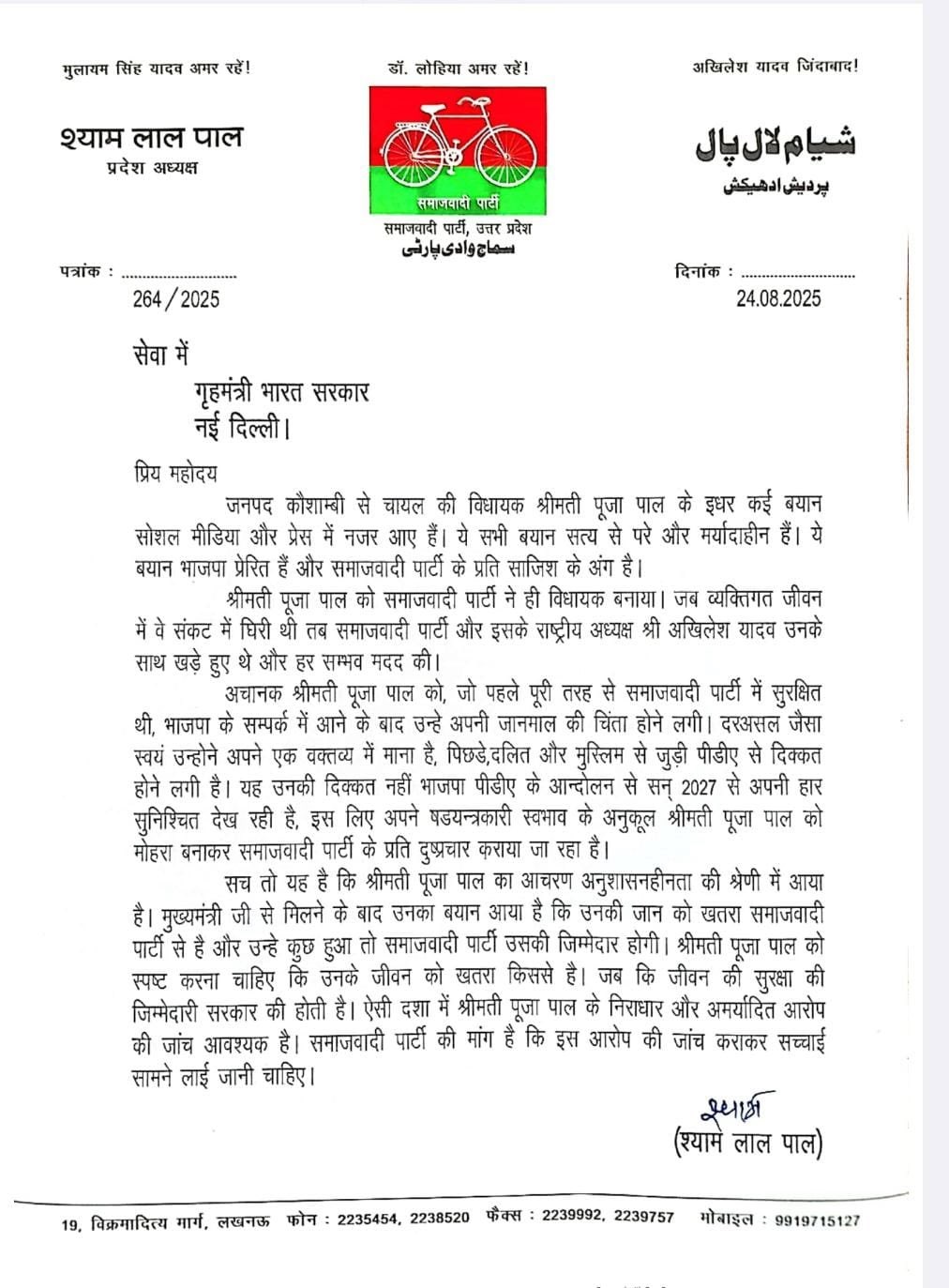 समाजवादी पार्टी के प्रदेश अध्यक्ष श्याल लाल पाल ने गृहमंत्री अमित शाह को पत्र लिखा है। इसमें उन्होंने लिखा कि, जनपद कौशाम्बी से चायल की विधायक पूजा पाल के इधर कई बयान सोशल मीडिया और प्रेस में नजर आए हैं। ये सभी बयान असत्य से परे और मर्यादाहीन हैं। ये बयान भाजपा प्रेरित है और समाजवादी पार्टी के प्रति साजिश के अंग है। पूजा पाल को समाजवादी पार्टी ने ही विधायक बनाया। जब व्यक्तिगत जीवन में वे संकट में घिरी थीं तब समाजवादी पार्टी और इसके राष्ट्रीय अध्यक्ष अखिलेश यादव उनके साथ खड़े हुए थे और हर सम्भव मदद की।