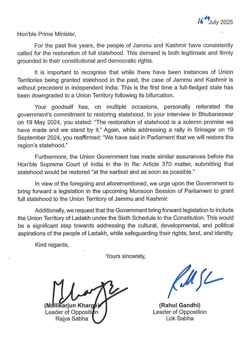 राहुल और खरगे ने पत्र में लिखा कि हम सरकार से अपील करते हैं कि वह संसद के आगामी मानसून सत्र में केंद्र शासित प्रदेश जम्मू और कश्मीर को पूर्ण राज्य का दर्जा देने के लिए एक विधेयक पेश करे। इसके अलावा हम सरकार से मांग करते हैं कि वह केंद्र शासित प्रदेश लद्दाख को संविधान की छठी अनुसूची में शामिल करने के लिए एक विधेयक भी लाए। यह लद्दाख के लोगों की सांस्कृतिक, विकासात्मक और राजनीतिक आकांक्षाओं को पूरा करने की दिशा में एक महत्वपूर्ण कदम होगा। इसके साथ ही यह उनके अधिकारों, भूमि और पहचान की रक्षा भी करेगा।’