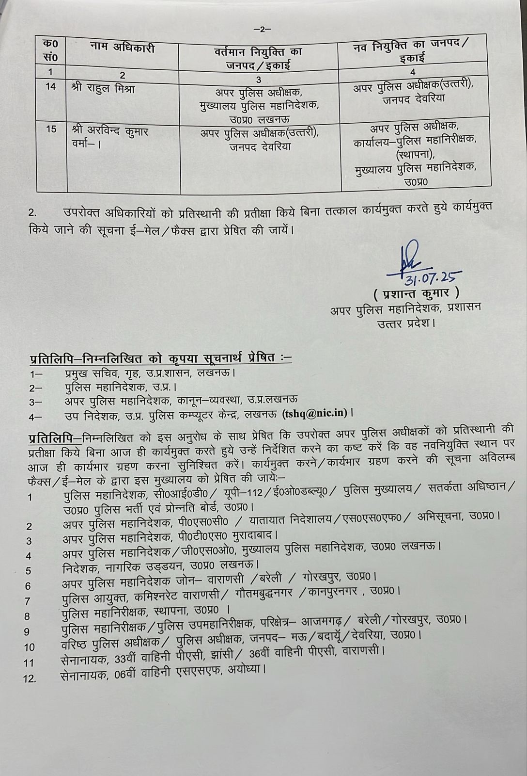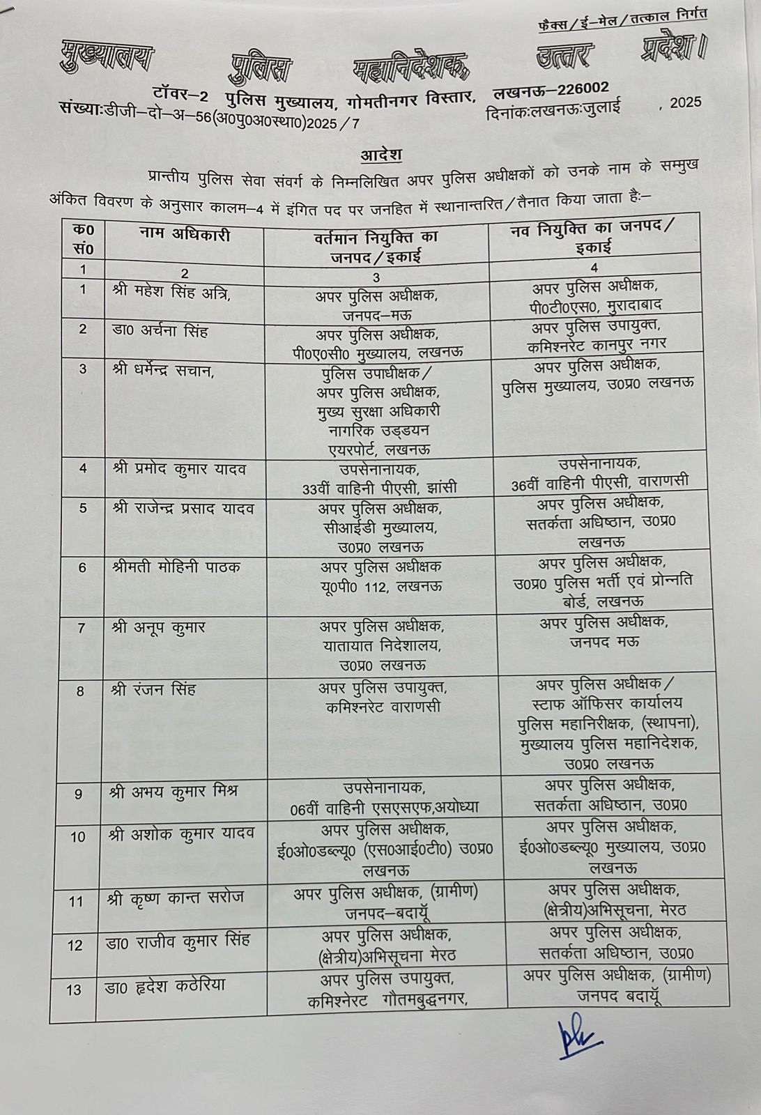 PPS Transfer: उत्तर प्रदेश में गुरुवार को 15 PPS अफसरों के तबादले हुए। इसमें मोहिनी पाठक को उत्तर प्रदेश पुलिस भर्ती एवं प्रोन्नति बोर्ड की अपर पुलिस अधीक्षक नियुक्त किया गया है। इसके साथ ही महेंश सिंह अत्रि को अपर पुलिस अधीक्षक पीटीएस मुरादाबाद के पद पर तैनाती दी गयी है। वहीं डॉ. अर्चना सिंह को अपर पुलिस उपायुक्त कमिश्नरेट कानपुर नगर और धर्मेंद्र सचान को अपर पुलिस अधीक्षक, पुलिस मुख्यालय, लखनऊ में तैनाती दी गई है।