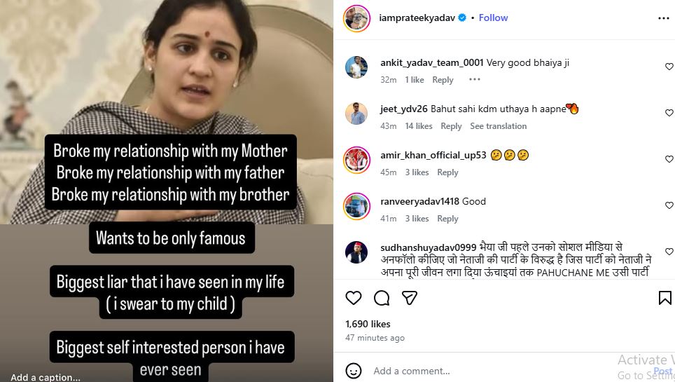 इस पोस्ट में प्रतीक यादव ने लिखा, मेरी मां से रिश्ता खत्म करवाया, मेरे भाई से रिश्ता खत्म करवाया। मेरे पिता से रिश्ता तुड़वाया। यह केवल फेमसा होना चाहती है। मैं अपने बच्चों की कसम खाकर कह रहा हूं कि मैंने अपनी जिंदगी में इससे झूठी औरत नहीं देखा है। सबसे बड़ी आत्ममुग्ध इंसान मैंने अपनी जिंदगी में नहीं देखी है।