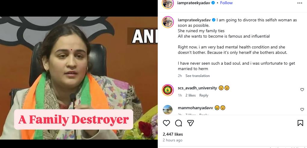 प्रतीक यादव के इस पोस्ट के बाद अब साफ हो चुका है कि, अर्पणा यादव और उनके बीच रिश्ते काफी बिगड़ चुके हैं। अब सोशल मीडिया पर प्रतीक यादव खुलकर अर्पणा यादव के विरोध में कर रहे हैं। वहीं, इससे पहले अर्पणा यादव ने लिखा था कि, मैं इस स्वार्थी औरत से जल्द से जल्द तलाक लेने जा रहा हूं। इसने मेरे पारिवारिक रिश्ते बर्बाद कर दिए। इसका एकमात्र लक्ष्य है मशहूर और प्रभावशाली बनना। इस समय मेरी मानसिक स्थिति बहुत खराब है। इसे कोई परवाह नहीं। इसे सिर्फ अपनी ही चिंता है। मैंने कभी ऐसी बुरी आत्मा नहीं देखी। मेरा दुर्भाग्य था कि मैंने इससे शादी की।