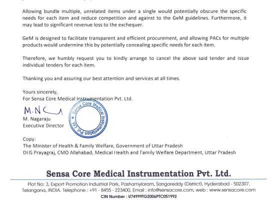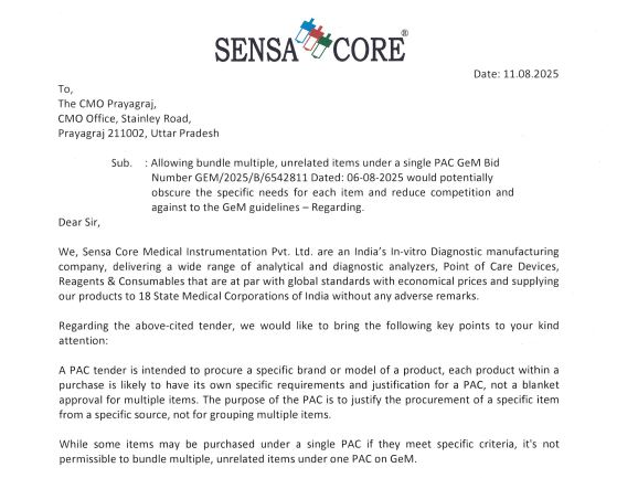 दरअसल, प्रयागराज के CMO ने बीते 06 अगस्त को एक टेंडर (GEM/2025/B/6542811) निकाला था। इस टेंडर को निकालते समय प्रयागराज के CMO ने ऐसी नियम और शर्तों रख दीं, जिससे कई कंपनियों को बड़ा झटका लगा। हालांकि, सूत्रों ने कहा, प्रयागराज के CMO ने ये टेंडर अपनी चेहती फर्म ट्रू एचबी के लिए निकाली थी, जिसके बाद अन्य कंपनियों ने इसको लेकर बगावत कर दी। हैदरबाद की एक कंपनी Sensa Core Medical Instrumentation Pvt. Ltd. ने इस टेंडर में कई अनियमितता का आरोप लगाते हुए इसे निरस्त करने की मांग की है।