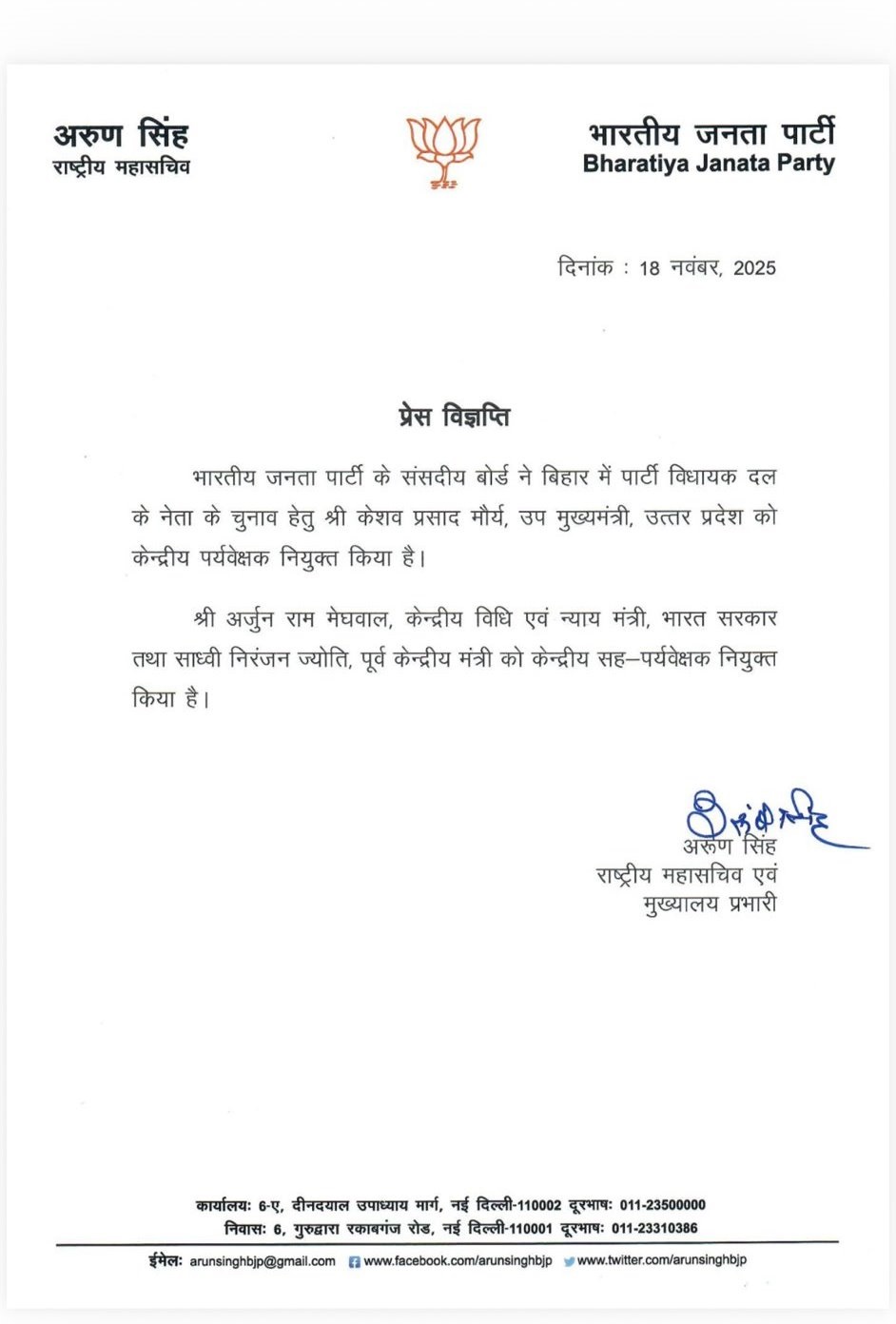 बिहार में एनडीए सरकार के गठन की तैयारियां शुरू हो गयी हैं। इसको लेकर भाजपा की तरफ से उत्तर प्रदेश के डिप्टी सीएम केशव प्रसाद मौर्य को बड़ी जिम्मेदारी दी गयी है। भाजपा ने केशव प्रसाद मौर्य को पर्यवेक्षक नियुक्त किया है। साथ ही, अर्जुन राम मेघवाल और साध्वी निरंजन ज्योति को सह पर्यवेक्षक बनाया है।