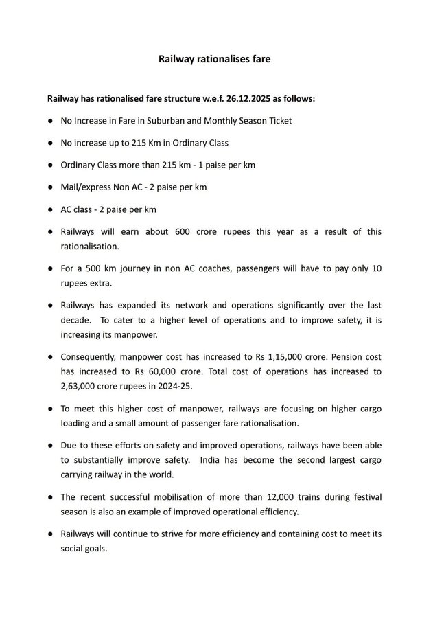 नई दिल्ली। अगर आप ट्रेन से सफर करते हैं, तो यह खबर आपके लिए जरूरी है। भारतीय रेलवे (Indian Railways) ने ट्रेन के किराए में बढ़ोत्तरी कर दी है, जो 26 दिसंबर 2025 से लागू होगा। हालांकि राहत की बात यह है कि छोटे सफर करने वाले यात्रियों पर इसका असर नहीं पड़ेगा, लेकिन लंबी दूरी की यात्रा अब थोड़ी महंगी जरूर हो जाएगी।