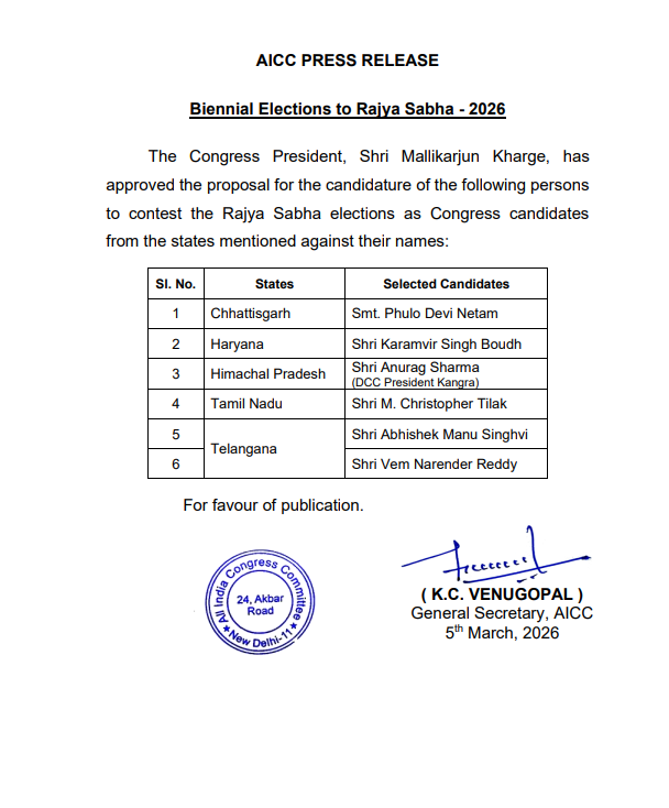कांग्रेस (Congress) ने राज्यसभा चुनाव (Rajya Sabha Elections 2026) के लिए गुरुवार को पांच राज्यों में छह उम्मीदवारों के नाम का एलान कर दिया है। कांग्रेस ने तेलंगाना से वरिष्ठ नेता अभिषेक मनु सिंघवी (Abhishek Manu Singhvi) और वेम नरेंद्र रेड्डी को उतारा है। रेड्डी तेलंगाना के मुख्यमंत्री के सलाहकार हैं।