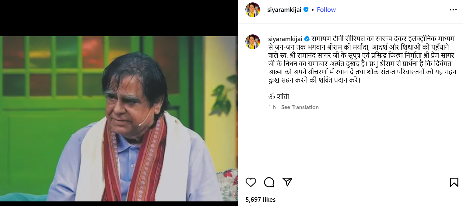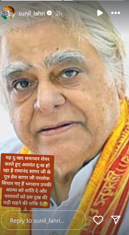 सुनील लहरी ने इंस्टाग्राम पर प्रेम सागर जी की तस्वीर शेयर करते हुए लिखा, ‘यह दुखद समाचार शेयर करते हुए अत्यंत दुख हो रहा है रामानंद सागर जी के पुत्र प्रेम सागर जी परलोक सिधार गए हैं। भगवान उनकी आत्मा को शांति दे और घरवालों को इस दुख की घड़ी को सहने की शक्ति दे’।