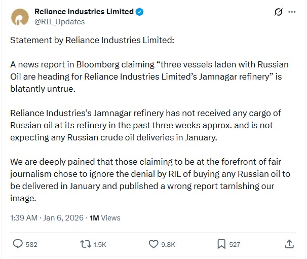 दरअसल, रिलायंस इंडस्ट्रीज लिमिटेड ने एक्स पर एक बयान जारी किया है। इस बयान में कहा गया है- ब्लूमबर्ग में छपी एक न्यूज़ रिपोर्ट जिसमें दावा किया गया है कि “रूसी तेल से भरे तीन जहाज़ रिलायंस इंडस्ट्रीज लिमिटेड की जामनगर रिफाइनरी की ओर जा रहे हैं,” यह सरासर झूठ है। रिलायंस इंडस्ट्रीज की जामनगर रिफाइनरी को पिछले लगभग तीन हफ़्तों में अपनी रिफाइनरी में रूसी तेल का कोई कार्गो नहीं मिला है और जनवरी में भी किसी रूसी कच्चे तेल की डिलीवरी की उम्मीद नहीं है।