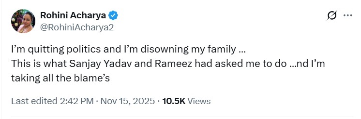 बिहार विधानसभा चुनाव 2025 रिजल्ट के बाद लालू यादव के परिवार में टूट पड़ गयी है। लालू यादव की छोटी बेटी और तेजस्वी यादव की बहन रोहिणी आचार्य ने सोशल मीडिया पर ऐसा पोस्ट शेयर किया है, जिससे हलचल बढ़ गयी है।
