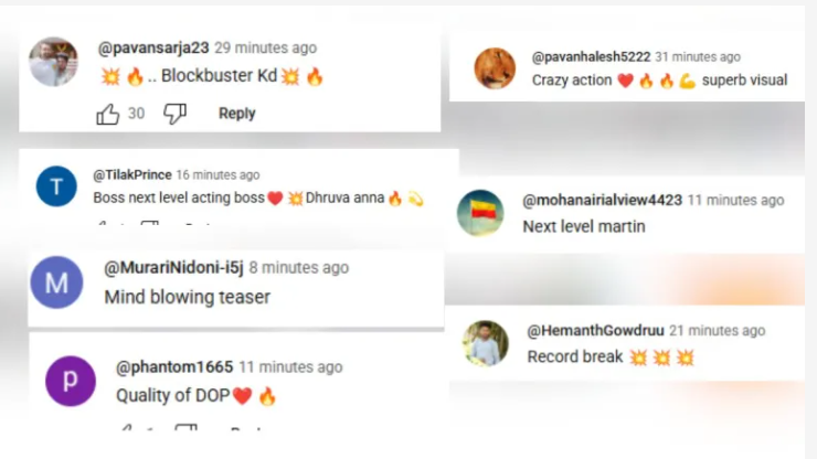 इस फिल्म का टीजर यूट्यूब पर आनंद स्टुडियो के वैबसाइट पर अपलोड किया गया है। इसके कमेंट सेक्शन में लोगों का रिएक्शन सामने आ रहा है। एक यूजर ने लिखा, ‘ ब्लॉकबस्टर केडी।’ दूसरे यूजर ने लिखा, ‘अलग लेवल की एक्टिंग है बॉस।’ तीसरे यूजर ने लिखा, ‘धमाकेदार टीजर है।’ चौथे यूजर ने लिखा, ‘बेहतरीन एक्शन सीन्स और विजुअल्स।’ वहीं एक अन्य यूजर ने लिखा, ‘ये मूवी बॉक्स ऑफिस पर रिकॉर्ड ब्रेक करेगी।’