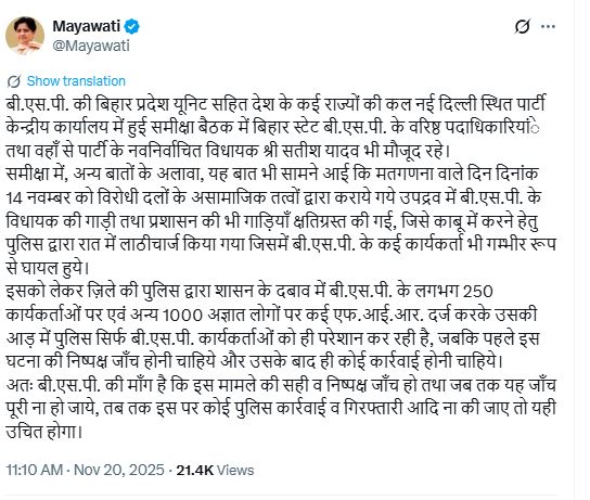 मायावती (Mayawati) ने एक्स पोस्ट पर लिखा कि बीएसपी (BSP) की बिहार प्रदेश यूनिट सहित देश के कई राज्यों की कल नई दिल्ली स्थित पार्टी केन्द्रीय कार्यालय में हुई समीक्षा बैठक में बिहार स्टेट बीएसपी के वरिष्ठ पदाधिकारियों तथा वहां से पार्टी के नवनिर्वाचित विधायक सतीश यादव भी मौजूद रहे।