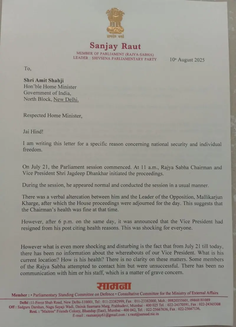 शिवसेना के उद्धव गुट के नेता संजय आउट ने एक्स वाइस प्रेसिडेंट जगदीप धनखड़ को लेकर केन्द्रीये गृह मंत्री अमित शाह को पत्र लिखा है। आइए बताते हैं की जिस तरह संजय ने पूर्व उपराष्ट्रपति के बारे में पूछा है क्या उन्हे सच में जगदीप जी का फिक्र है या भाजपा पर तंज़ कस रहे हैं।वहीं संजय ने पत्र में पूछा है कि जगदीप धनखड़ कहां हैं, उनका स्वास्थ्य कैसा है और क्या वह सुरक्षित हैं