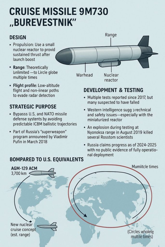 रूस ने ब्यूरेवस्तनिक को एक नाभिकीय-प्रेरित (Nuclear-Powered) क्रूज़ मिसाइल के रूप में पेश किया है यानी इसमें एक छोटा परमाणु रिएक्टर भी रहेगा जो मिसाइल को अनवरत ऊर्जा देगा। जिससे उसकी रेंज सैद्धान्तिक तौर पर लगभग अनंत हो सकती है। अगर यह पूरी तरह से सच हुआ तो वाकई रूस दुनिया का पहला देश होगा, जिसके पास इतनी ताकतवर नाभिकीय-प्रेरित मिसाइल होगी।