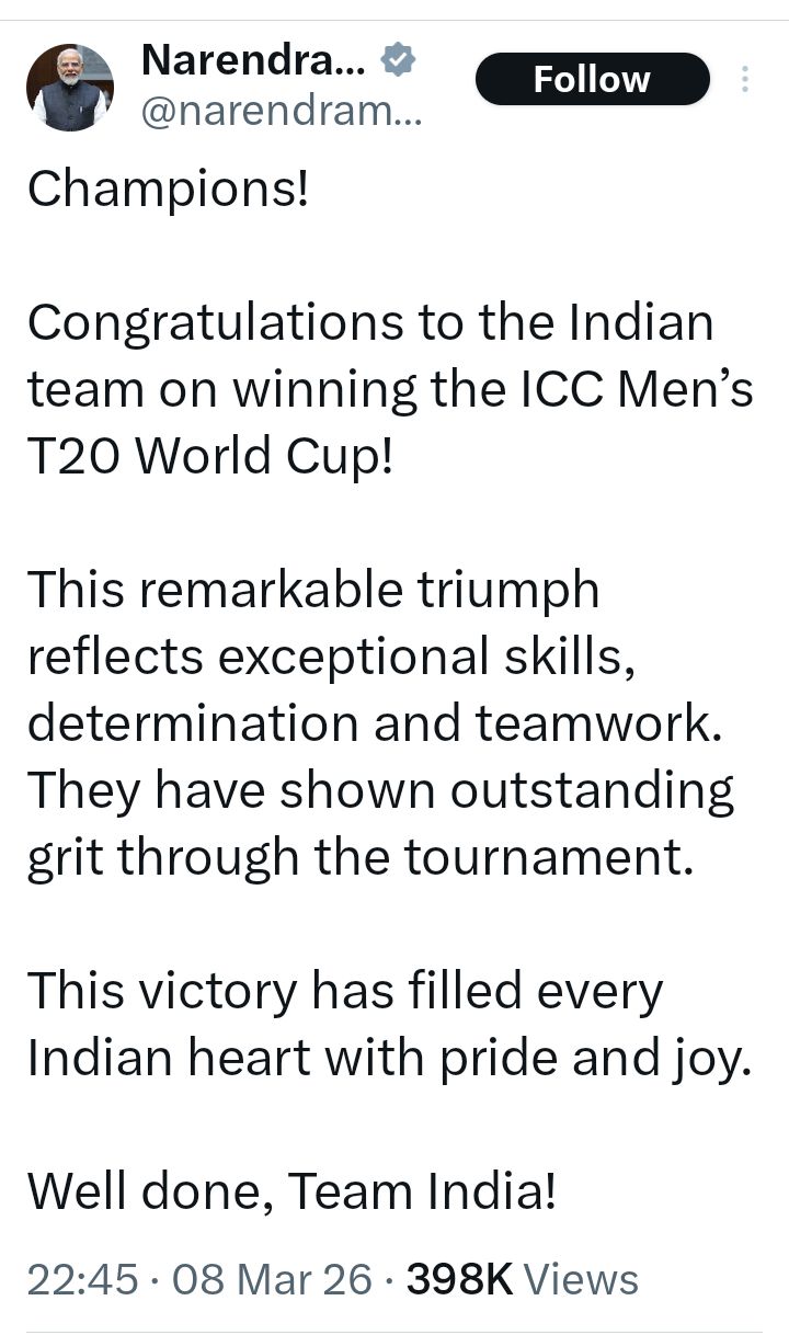 T20 World Cup Champion : प्रधानमंत्री नरेंद्र मोदी ने टी20 विश्वकप जीतने पर टीम इंडिया को बधाई दी है। पीएम मोदी ने सोशल मीडिया पर साझा एक पोस्ट में लिखा, 'चैंपियंस! आईसीसी मेन्स टी20 वर्ल्ड कप जीतने पर भारतीय टीम को बधाई। यह शानदार जीत जबरदस्त स्किल्स, पक्के इरादे और टीमवर्क को दिखाती है।