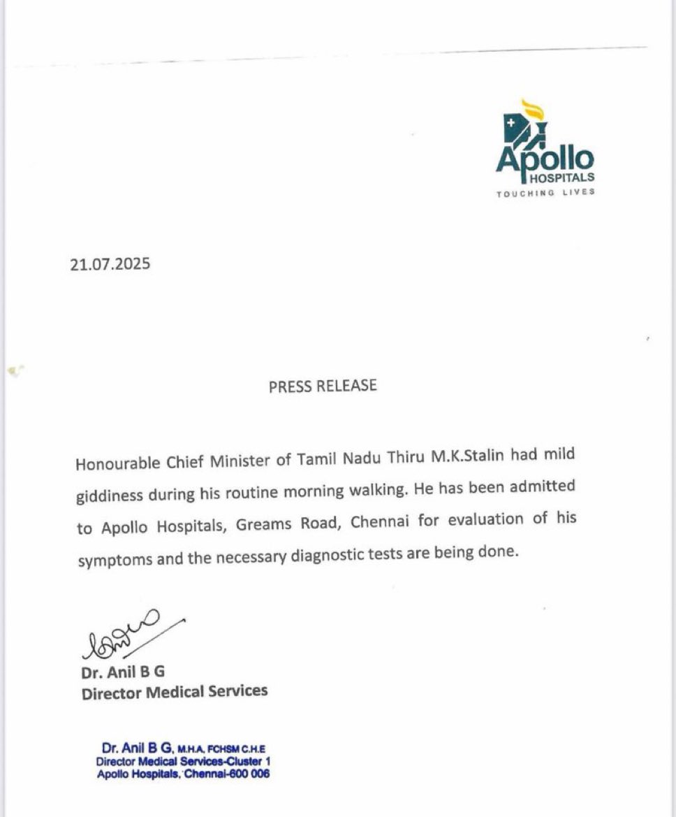 मुख्यमंत्री ने एक्स पोस्ट पर लिखा था कि, “आज थकान सी लग रही थी। टेस्ट कराने पर कोविड की पुष्टि होने के बाद मैंने खुद को आइसोलेट कर लिया है।” उन्होंने कहा, “आइए हम सभी मास्क पहनकर सुरक्षित रहें और वैक्सीन लगवाएं”। ऐसे में राज्यपाल आर एन रवि और अन्नाद्रमुक के विपक्षी नेताओं ने स्टालिन के शीघ्र स्वस्थ होने की कामना की है। बता दें कि कुछ दिनों पहले ही सरकार द्वारा शेयर की गई तस्वीरों में मुख्यमंत्री बिना मास्क लगाए नजर आए थे। हाल ही में वह 11 और 12 तारीख को एक शादी में शामिल हुए थे और द्रविड़ कड़गम नेता के वीरमणि सहित कई लोगों से मुलाकात की थी। इसके अलावा 8 और 9 तारीख को तिरुवन्नामलाई जिले में स्टालिन ने सरकारी कार्यक्रमों में भारी भीड़ होने के बावजूद बिना मास्क पहने हिस्सा लिया था। हॉस्पिटल की प्रेस रिलीज में कहा गया कि मॉर्निंग वॉक के दौरान CM को कमजोरी महसूस हुई और चक्कर आया जिसके बाद उन्हें अस्पताल में एडमिट किया गया।