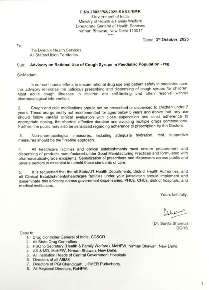 स्वास्थ्य सेवा महानिदेशालय (DGHS) ने बाल रोगियों में कफ सिरप के तर्कसंगत उपयोग पर परामर्श जारी किया है। महानिदेशालय के तरफ से जारी आदेश के मुताबिक 2 वर्ष से कम उम्र के बच्चों को खांसी और सर्दी की दवाएं नहीं दी जानी चाहिए। आमतौर पर 5 वर्ष से कम उम्र के बच्चों के लिए इनकी अनुशंसा नहीं की जाती है। किसी भी दवा के उपयोग के लिए सावधानीपूर्वक नैदानिक मूल्यांकन, कड़ी निगरानी और उचित खुराक, न्यूनतम प्रभावी अवधि और कई दवाओं के संयोजन से बचने का कड़ाई से पालन किया जाना चाहिए। इसके अलावा, डॉक्टरों द्वारा निर्धारित दवाओं के पालन के बारे में जनता को भी जागरूक किया जा सकता है।
