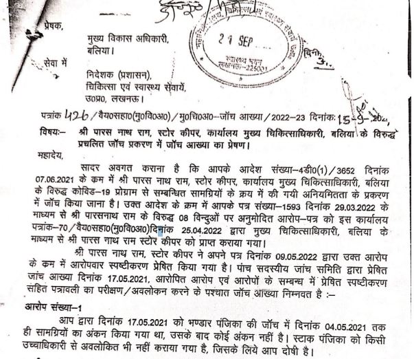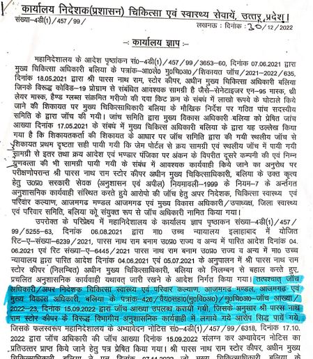 लखनऊ। उत्तर प्रदेश का स्वास्थ्य विभाग इन दिनों चर्चाओं में बना हुआ है। सीएमओ की ट्रांसफर-पोस्टिंग से लेकर टेंडर प्रक्रिया में भी खेल किया जा रहा है। यही नहीं, स्वास्थ्य विभाग के घोटालेबाज भी दोषी पाए जाने के बाद भी अपने पद पर जमे हुए हैं। ऐसे में लगता है कि, स्वास्थ्य विभाग के अफसरों पर स्टोरकीपर जैसे कर्मचारी भारी पड़ने लगे हैं। दरअसल, हम बात कर रहे हैं, बलिया के मुख्य चिकित्साधिकारी कार्यालय में तैनात स्टोर कीपर पारस नाथ राम की, जिसने कोविड के दौरान जमकर धांधली की। जांच में उसपर लगे आरोप सत्य भी पाए गए, इसके बाद भी वो अपनी जगह पर आज भी तैनात है। विधायक केतकी सिंह ने भी प्रमुख सचिव चिकित्सा को पत्र लिखकर स्टोर कीपर पारस नाथ राम को दूसरे जगह स्थान्तरण करने की बात कही थी। इसके साथ ही यूपी सरकार के परिवहन मंत्री भी उसकी शिकायत कर चुके हैं।