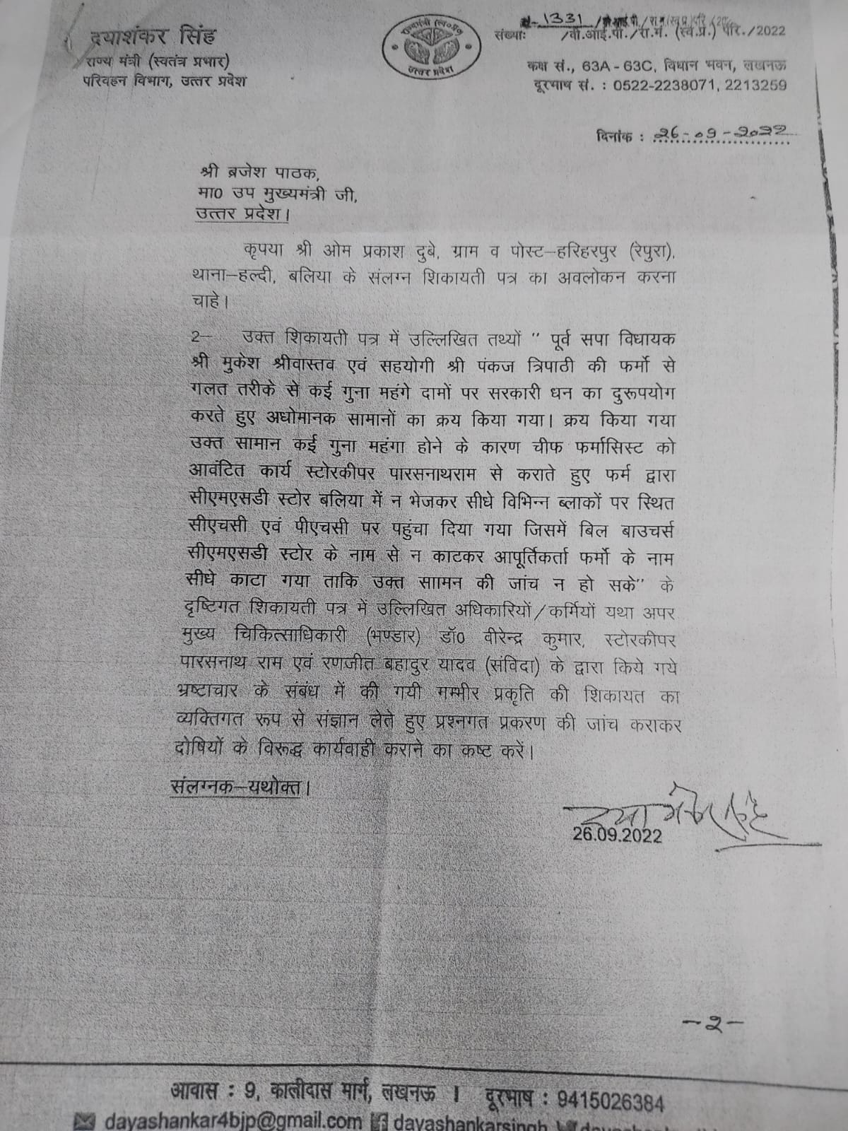 यही नहीं, मुकेश श्रीवास्तव, स्टोरकीपर पारसनाथ और पंकज त्रिपाठी के गठजोड़ की शिकायत यूपी सरकार के परिवन मंत्री दयाशंकर सिंह ने भी की थी। उन्होंने डिप्टी सीएम ब्रजेश पाठक को पत्र लिखा था, जिसमें उन्होंने कहा था कि, मुकेश श्रीवास्तव एवं सहयोगी पंकज त्रिपाठी की फर्मों से गलत तरीके से कई गुना महंगे दामों पर सरकारी धन का दुरूपयोग करते हुए अधोमानक सामानों का क्रय किया गया। इस पूरे मामले में उन्होंने स्टोरकीपर पारसनाथ का भी जिक्र किया था। उन्होंने कहा था कि, पारसनाथ इस पूरे मामले में मुकेश की मदद कर रहा है।