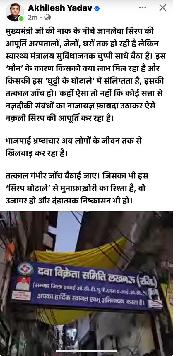 अखिलेश ने आगे लिखा, ‘इस ‘मौन’ के कारण किसको क्या लाभ मिल रहा है और किसकी इस ‘घुट्टी के घोटाले’ में संलिप्तता है, इसकी तत्काल जाँच हो। कहीं ऐसा तो नहीं कि कोई सत्ता से नज़दीकी संबंधों का नाजायज़ फ़ायदा उठाकर ऐसे नक़ली सिरप की आपूर्ति कर रहा है। भाजपाई भ्रष्टाचार अब लोगों के जीवन तक से खिलवाड़ कर रहा है। तत्काल गंभीर जाँच बैठाई जाए। जिसका भी इस ‘सिरप घोटाले’ से मुनाफ़ाख़ोरी का रिश्ता है, वो उजागर हो और दंडात्मक निष्कासन भी हो।’