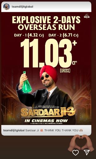 फिल्म के कामयाबी को देखकर दिलजीत के खुशी का ठिकाना नही है। दिलजीत ने इंस्टाग्राम पर एक पोस्ट शेयर किया है। इसमें पाकिस्तान थिएटर में आडियन्स बैठी दिख रही है और ‘सरदार जी 3’फिल्म को देखकर रिएक्शन दे रही है। उन्होने जो विडियो शेयर किया है उसमें हानिया आमिर का सीन दिख रहा है। थिएटर हाउसफुल नज़र आ रहा है। पोस्ट के साथ ही दिलजीत ने कैपशन दिया कि देश में सबसे ज्यादा 12 शो अल्ट्रा स्क्रीन पर दिखाये जाते हैं। ‘सरदार जी3’ को दर्शकों से खूब प्यार मिल रहा है आइए और फिल्म देखते हैं।