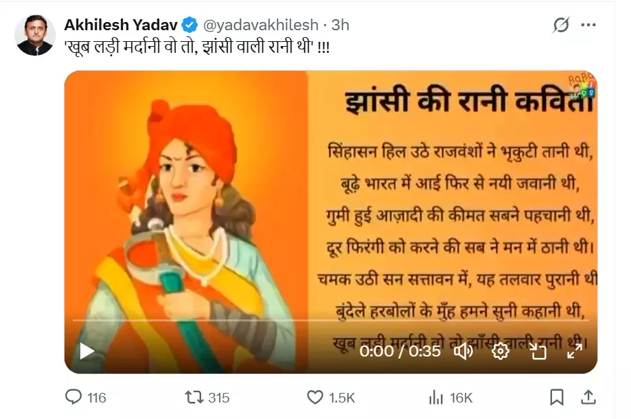 अखिलेश ने कहा कि राजनीति में परिवार की भागीदारी को “वंशवाद” कहने वाले भूल जाते हैं कि उनके परिवार के लोग भी संघर्ष, जेल, हमले, मुकदमों और सत्ता की प्रताड़ना झेलते हैं। यह परिवारवाद नहीं, बलिदानवाद है। उन्होंने तंज किया कि कुछ लोग राजनीति को बिजनेस समझते हैं, इसलिए अपने परिवार को सामने नहीं लाते—उन्हें डर होता है कि कहीं उनकी कमाई और धंधे उजागर न हो जाएं। अखिलेश ने कहा कि समाजवादी गठबंधन (PDA) अब चुप नहीं रहेगा। हर परिवार के दुख-दर्द को अपनी लड़ाई मानने वाला—अब अन्याय के हर हमले का जवाब देगा। पीडीए न अपमान सहेगा, न चुप रहेगा। अंत में अखिलेश यादव ने झांसी की रानी के संघर्ष को नमन करते हुए यह पोस्ट करके अपनी लड़ाई का एलान किया है।