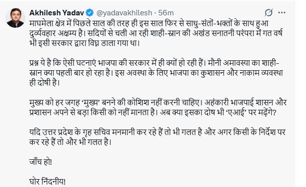 प्रश्न ये है कि ऐसी घटनाएं भाजपा की सरकार में ही क्यों हो रही हैं। मौनी अमावस्या का शाही-स्नान क्या पहली बार हो रहा है। इस अवस्था के लिए भाजपा का कुशासन और नाकाम व्यवस्था ही दोषी है। मुख्य को हर जगह ‘मुख्य’ बनने की कोशिश नहीं करनी चाहिए। अहंकारी भाजपाई शासन और प्रशासन अपने से बड़ा किसी को नहीं मानता है। अब क्या इसका दोष भी ‘एआई’ पर मढ़ेंगे? उन्होंने आगे लिखा, यदि उत्तर प्रदेश के गृह सचिव मनमानी कर रहे हैं तो भी गलत है और अगर किसी के निर्देश पर कर रहे हैं तो और भी गलत है। जाँच हो!