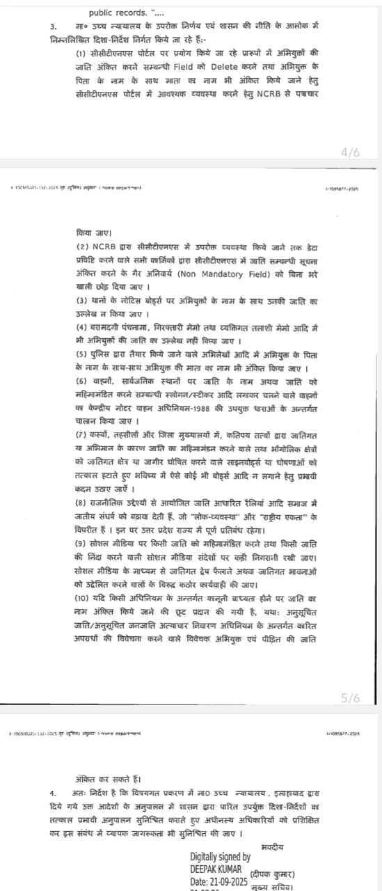 आदेश में कहा गया है कि पुलिस अभिलेखों, सार्वजनिक संकेतों में जाति का प्रदर्शन रोका जाए और जातीय संघर्ष प्रेरित करने वालों के खिलाफ कठोर कार्रवाई की जाए। राष्ट्रीय अपराध रिकॉर्ड ब्यूरो (NCRB) के क्राइम क्रिमिनल ट्रैकिंग नेटवर्क एंड सिस्टम (CCTNS) में अभियुक्तों की जाति बताने वाले कॉलम को हटाया जाए और अभियुक्तों के पिता के साथ मां का भी नाम दर्ज हो। वाहनों और सार्वजनिक स्थानों पर जाति का महिमामंडन करने वालों पर भी कार्रवाई को कहा गया है।