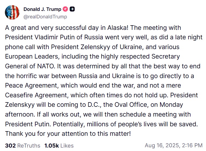 अमेरिकी राष्ट्रपति डोनाल्ड ट्रंप ने ट्रुथ सोशल प्लेटफॉर्म पर लिखा, “अलास्का में एक शानदार और बेहद सफल दिन! रूस के राष्ट्रपति व्लादिमीर पुतिन के साथ बैठक बहुत अच्छी रही, साथ ही यूक्रेन के राष्ट्रपति ज़ेलेंस्की और नाटो के अत्यंत सम्मानित महासचिव सहित विभिन्न यूरोपीय नेताओं के साथ देर रात हुई फ़ोन कॉल भी बहुत अच्छी रही। सभी ने यह तय किया कि रूस और यूक्रेन के बीच भीषण युद्ध को समाप्त करने का सबसे अच्छा तरीका सीधे शांति समझौते पर पहुँचना है, जिससे युद्ध समाप्त हो जाएगा, न कि केवल युद्धविराम समझौता, जो अक्सर टिक नहीं पाता। राष्ट्रपति ज़ेलेंस्की सोमवार दोपहर को डी.सी., ओवल ऑफिस, आएँगे। अगर सब कुछ ठीक रहा, तो हम राष्ट्रपति पुतिन के साथ एक बैठक का कार्यक्रम तय करेंगे। संभवतः, लाखों लोगों की जान बच जाएगी।”