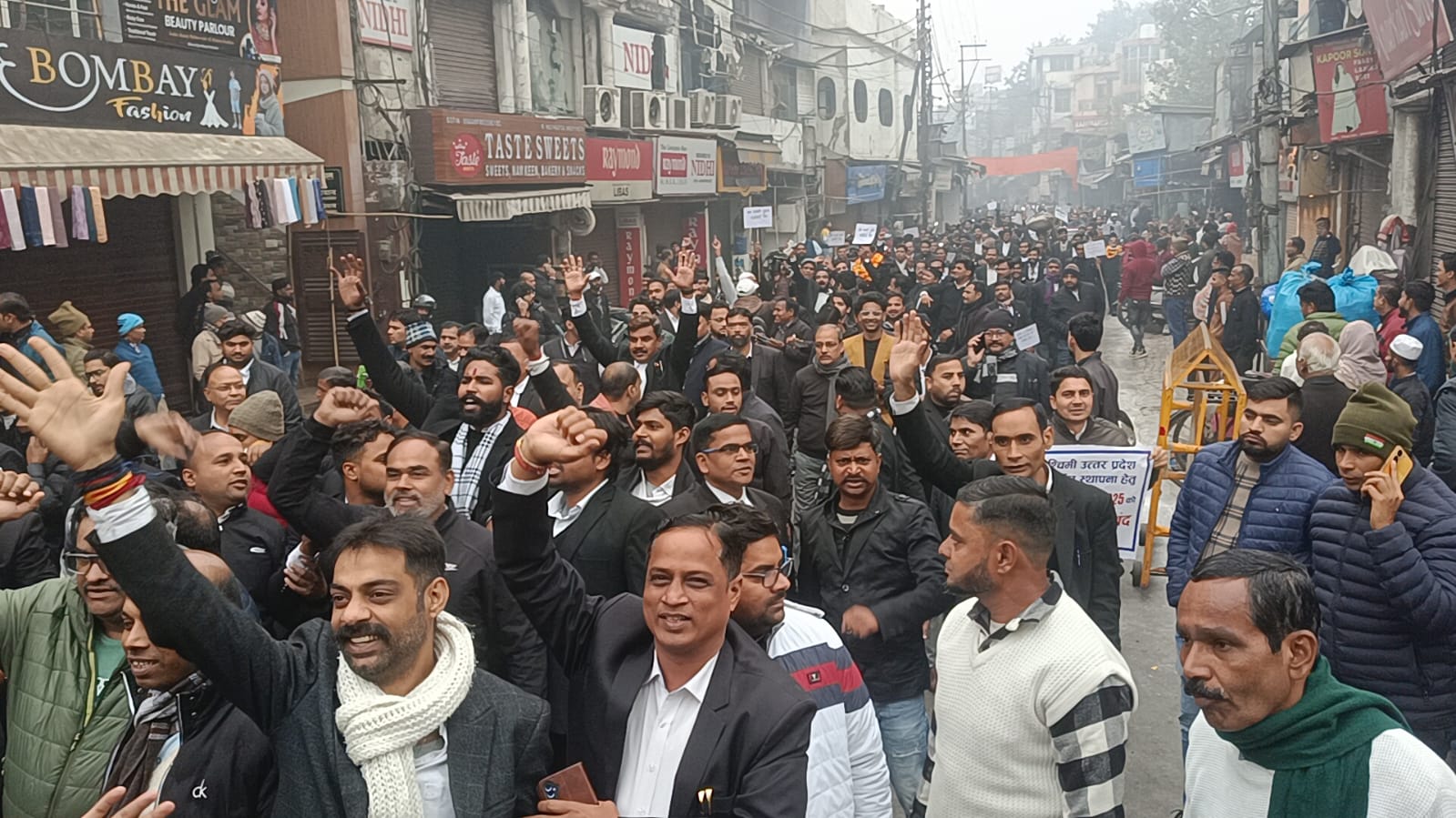 मुरादाबाद:- पश्चिमी उत्तर प्रदेश में हाईकोर्ट बेंच की मांग को लेकर मुरादाबाद में अधिवक्ताओं ने शहर में पैदल मार्च निकाला, अधिवक्ताओं के समर्थन में भी शहर के वायपारियों ने भी बाजार बंद रखा. यह मार्च मुगलपुरा थाना क्षेत्र के राजकीय इंटर कॉलेज से मंडी चौक, कोतवाली होते हुए कलक्ट्रेट पहुँच कर जिलाधिकारी अनुज कुमार के माध्यम से शासन को पश्चिमी उत्तर प्रदेश में हाई कोर्ट बैंच की स्थापना हेतु ज्ञापन सौंपा.