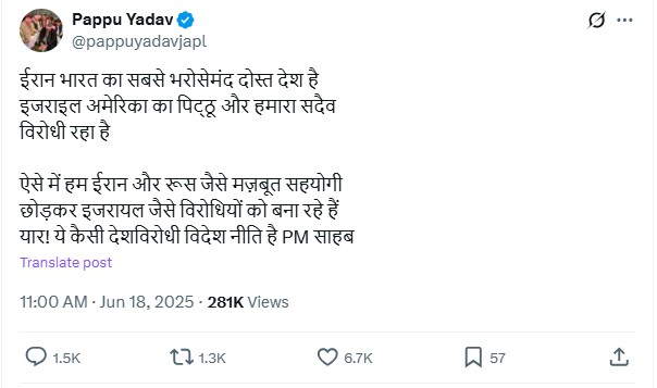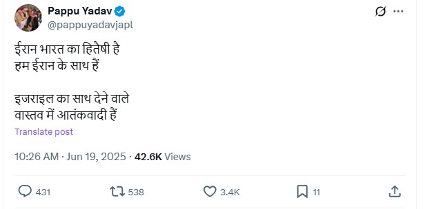 बिहार के पूर्णिया से निर्दलीय सांसद राजेश रंजन उर्फ पप्पू यादव ने सोशल मीडिया प्लेटफॉर्म के माध्यम से इजरायल का समर्थन करने वालों पर निशाना साधा। उन्होंने गुरुवार को एक्स पोस्ट में लिखा, ‘ईरान भारत का हितैषी है हम ईरान के साथ हैं इजराइल का साथ देने वाले वास्तव में आतंकवादी हैं।’