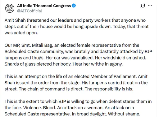 In a shocking display of cowardice, our MP and a representative of the Scheduled Caste community, Smt. Mitali Bag, was brutally attacked today by BJP’s goons. Her car was vandalised and the windshield smashed, leaving her with serious injuries from glass shards.